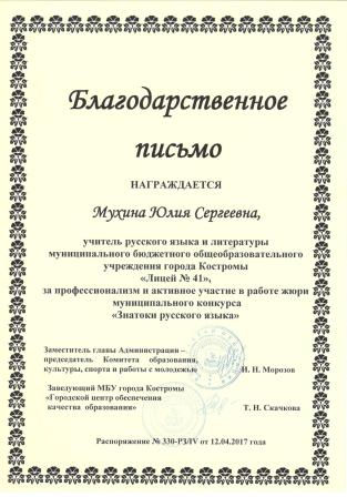 С первого года работы в школе стала активным участником педагогического сообщества города Костромы. С 2015 года являюсь членом жюри муниципального этапа «Всероссийской олимпиады школьников по русскому языку», а также оцениваю работы учащихся 4-6 классов в олимпиаде «Знатоки русского языка».